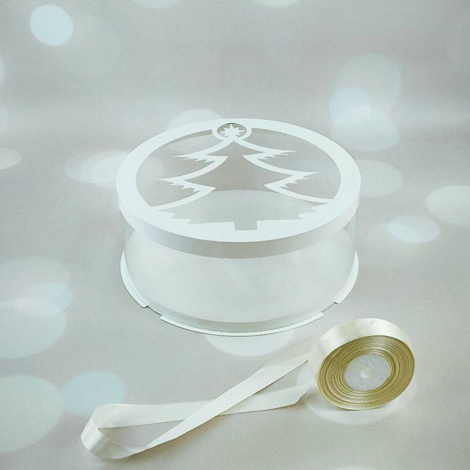 Weiße Tubenschachtel. Die Höhe der Tubenbasis beträgt 12 mm. Der Deckel besteht aus Pappe, mit transparentem Fenster aus Frischhaltefolie (PET). Die Tubenbasis besteht aus Mehrlagenpappe und kann als Tortenunterlage dienen, auf der Basis kann die Torte ohne Verwendung der Unterlage zusammengebaut werden. Die maximale Belastung der Schachtel im zusammengebauten Zustand beträgt 2 kg.